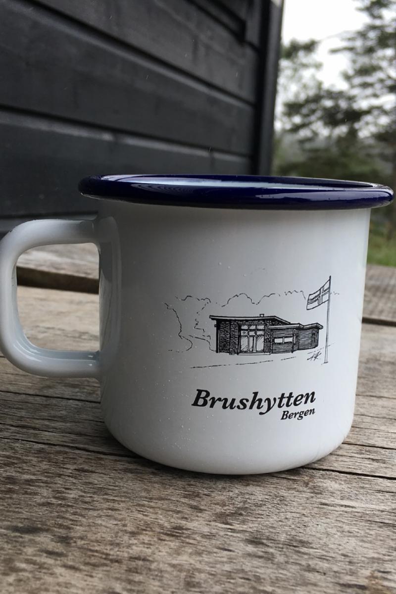 Emaljekoppen som er laget med Brushytten sitt eget design.